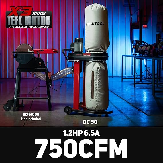 BUCKTOOL 1.2 HP Auto Start 750CFM Dust Collector with 3 Dust Collection Bag, 5.4 Cubic Bag Capacity and 5 PCS Reducer for Woodworking